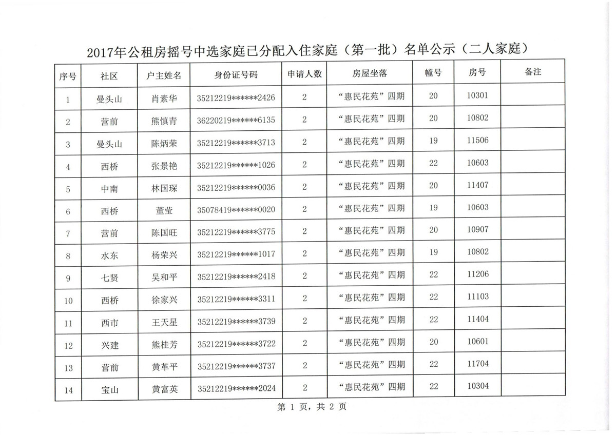 2017年公租房摇号中选家庭已分配入住家庭(第一批)名单公示